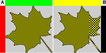 Erityisen merkillepantavaa näissä kuvissa on se, että vierekkäisten 'lehtien' värit ovat täysin identtiset. (Ks. punavihreistä väreistä enemmän sivulla INFO.)
