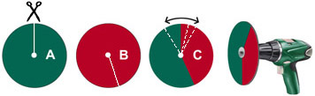 Yhdistä koetta varten värikiekot lomittain halkeamiin. Sijoita kiekot ja tukilevy pulttiin mutterilla prikkojen väliin. Purista mutterilla osat tukevasti yhteen ja kiinnitä porakoneeseen. Varo pyörittämästä kiekkoja liian nopeasti. Katso, että kiekkojen pyörimissuunta on 'myötäkarvainen', ettei ilmavirta revi kiekkoja irti.