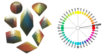 When trying to demonstrate colours and the perception of colour phenomena, the colour columns of the RGB-diagrams can be used to show: