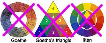 Toisin sanoen tässä taidemaalareidenkin suosimassa väriopin "teoriassa" sekoitetaan sujuvasti, mutta virheellisesti, värivalojen (RGB) ja väriaineiden (CMY) värinmuodostus keskenään kuin puurot ja vellit. (Seuraavassa on syytä olla 'älyllisesti hyvin hereillä':)