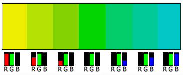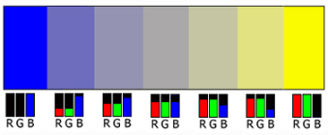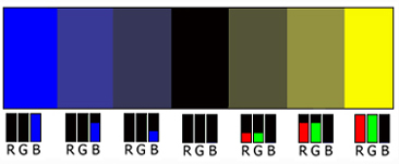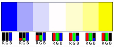 - sekoittuessaan / yhdistyessään additiivisessa, valoisuutta lisäävässä värinmuodostuksessa, jolloin värit vaalentavat toisiaan aina valkoiseksi asti,